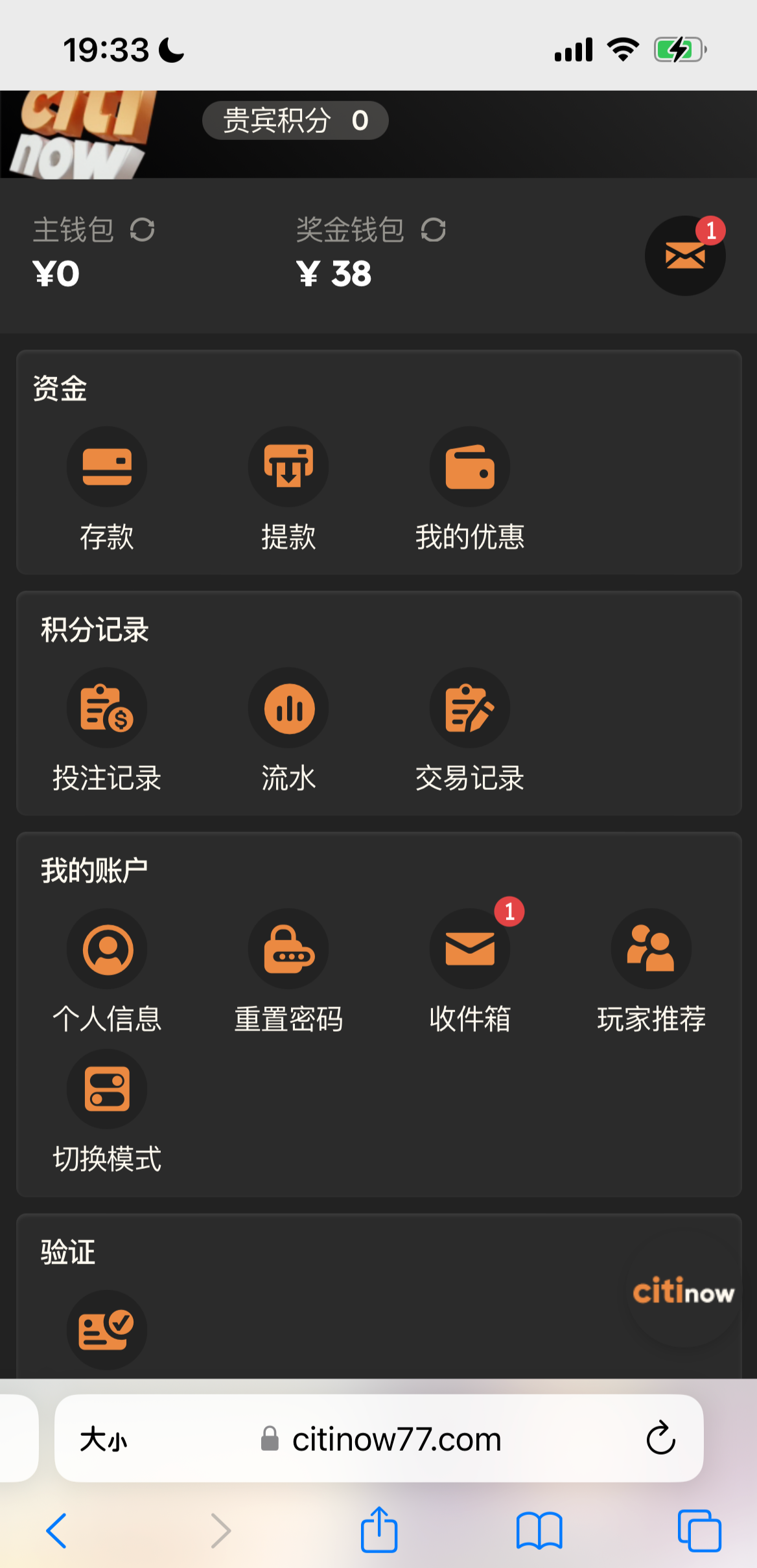 注册账号了手机号接收不到验证码的话找在线客服申请手动验证,客服会让你加客服微信验证就可以了,验证完在个人中心我的优惠里领取,要打190流水才能转出中心钱包,我就撸了一个号没打出来,老哥们加油,好像还没看到有人发过这个,祝各位大红,网址https://citinow77.com/cn/cn