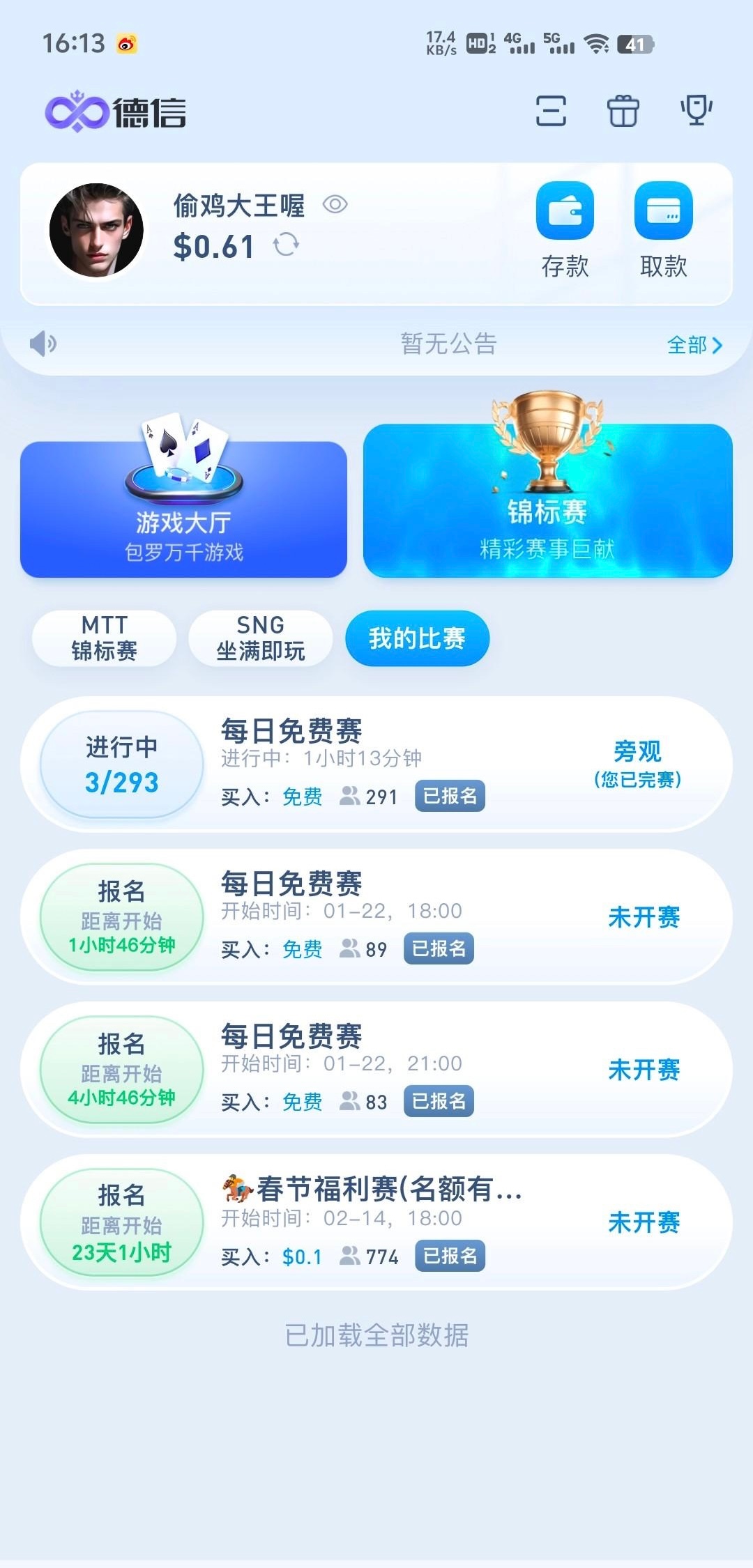 这个每天有四场免费赛,12点,3点,6点,9点,只要打出够1.1u,就去打每日快速赛1.1,2.2的比赛这个基本没什么人报名玩,最多10人进,只要稳一点基本可以吃前三名,够50u就可以提了,我打了两天已经到账50,白嫖即可不要充值官网DX.vip