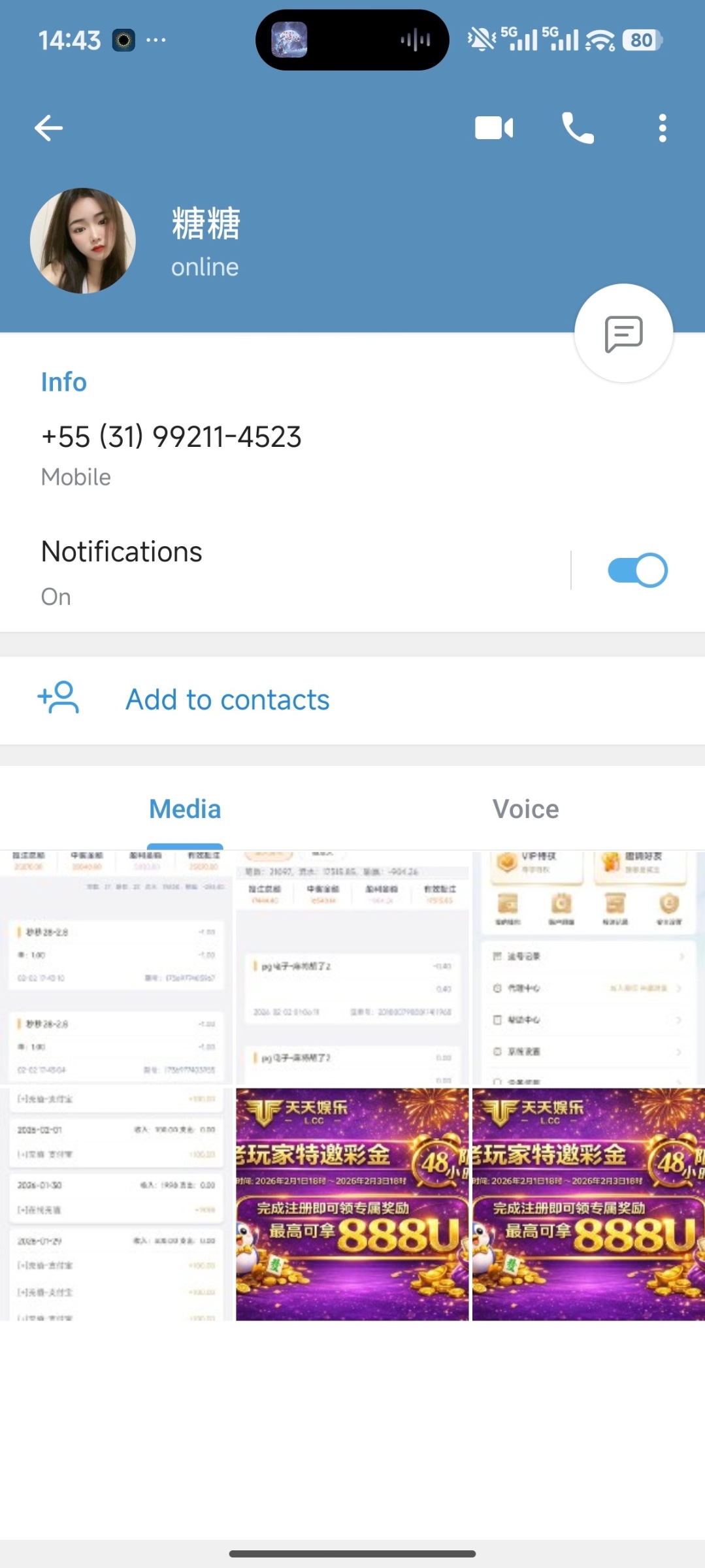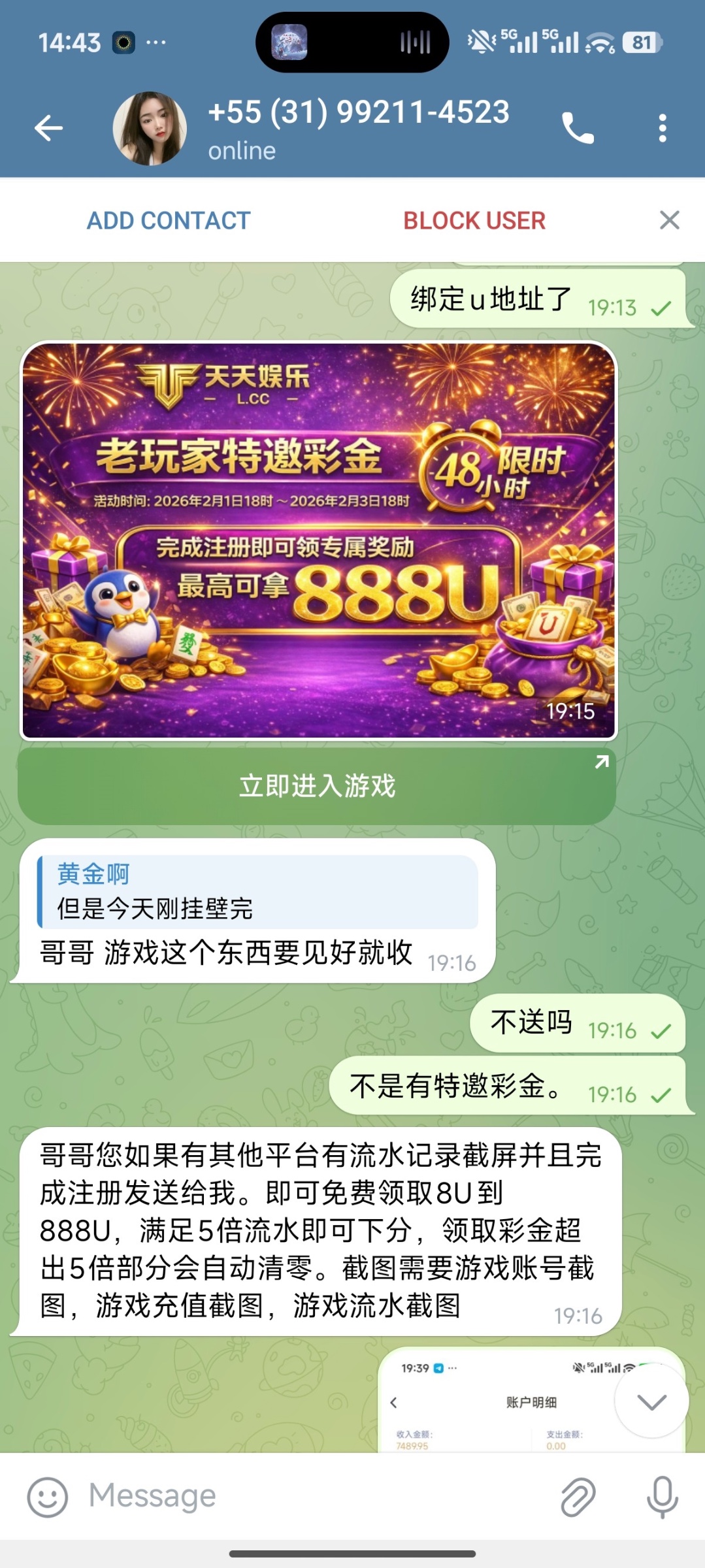 8到888u添加好友女头像那个,你们自己搜索添加。我发了别的台子充值记录和投注记录送了18u,麻将1和麻将2没水。两下输完。+55(31)99211-4523