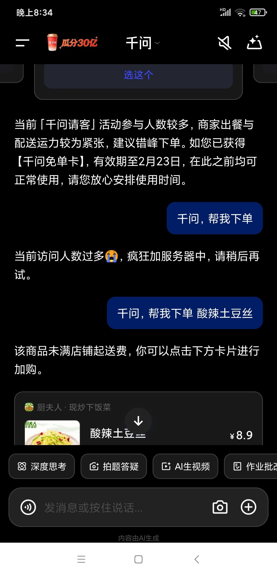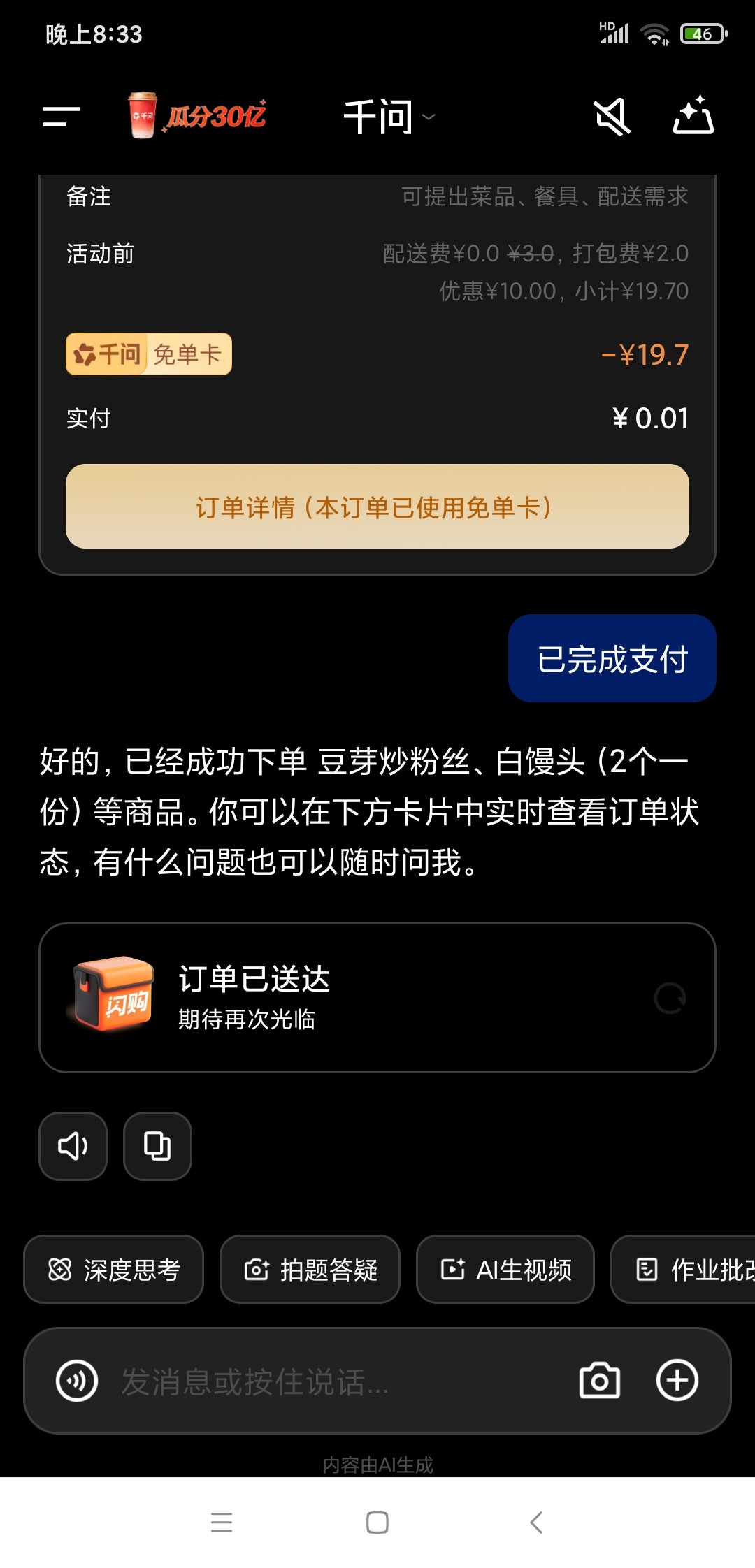 返回千问,打开定位,不要发【帮我点一杯奶茶】,而是发,【帮我点外卖】,隔一会儿就发几遍,直到提示让你绑定淘宝闪购的账号,然后会出现外卖选项。并且确定地址。出现可以点的店铺和菜后,点进去,自己挑菜品,默认使用25的劵,然后重复下单,直到下单完成为止,会从你手机号的支付宝自动扣款,我点的0.01就是0.01,支付完成后提示系统卡顿不要怕,登录淘宝就可以查看刚才的订单了希望大家都能得吃