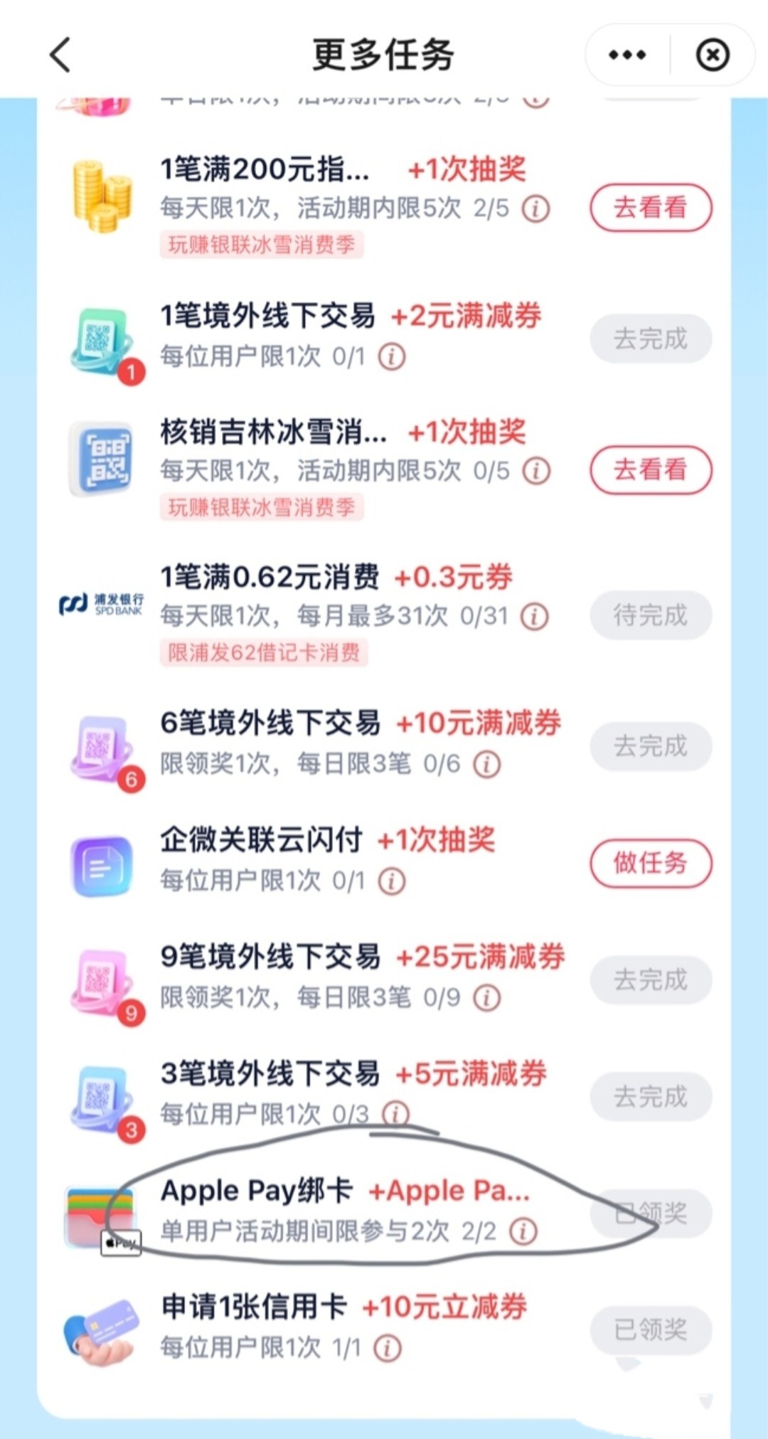 云闪付APP玩赚中心 绑两个从没绑过的卡到Apple Pay有2张10元券,苹果用户可以