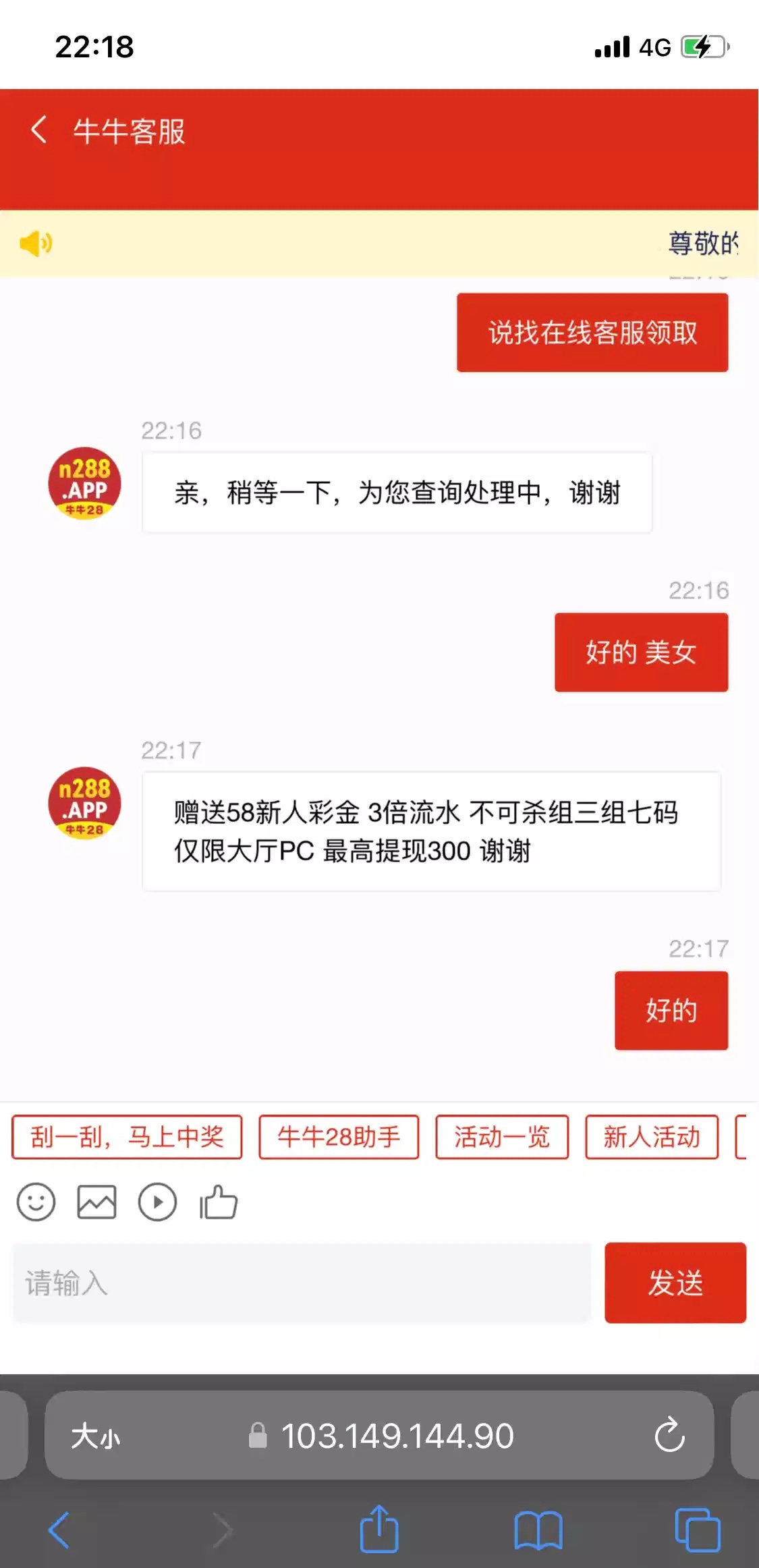 https://麦格菲.cn:38888/admin.html 从这里进去找到牛牛28注册等电话送 我本来是想去批U的 没想到过一会给我来电话送58了 白嫖一百出来